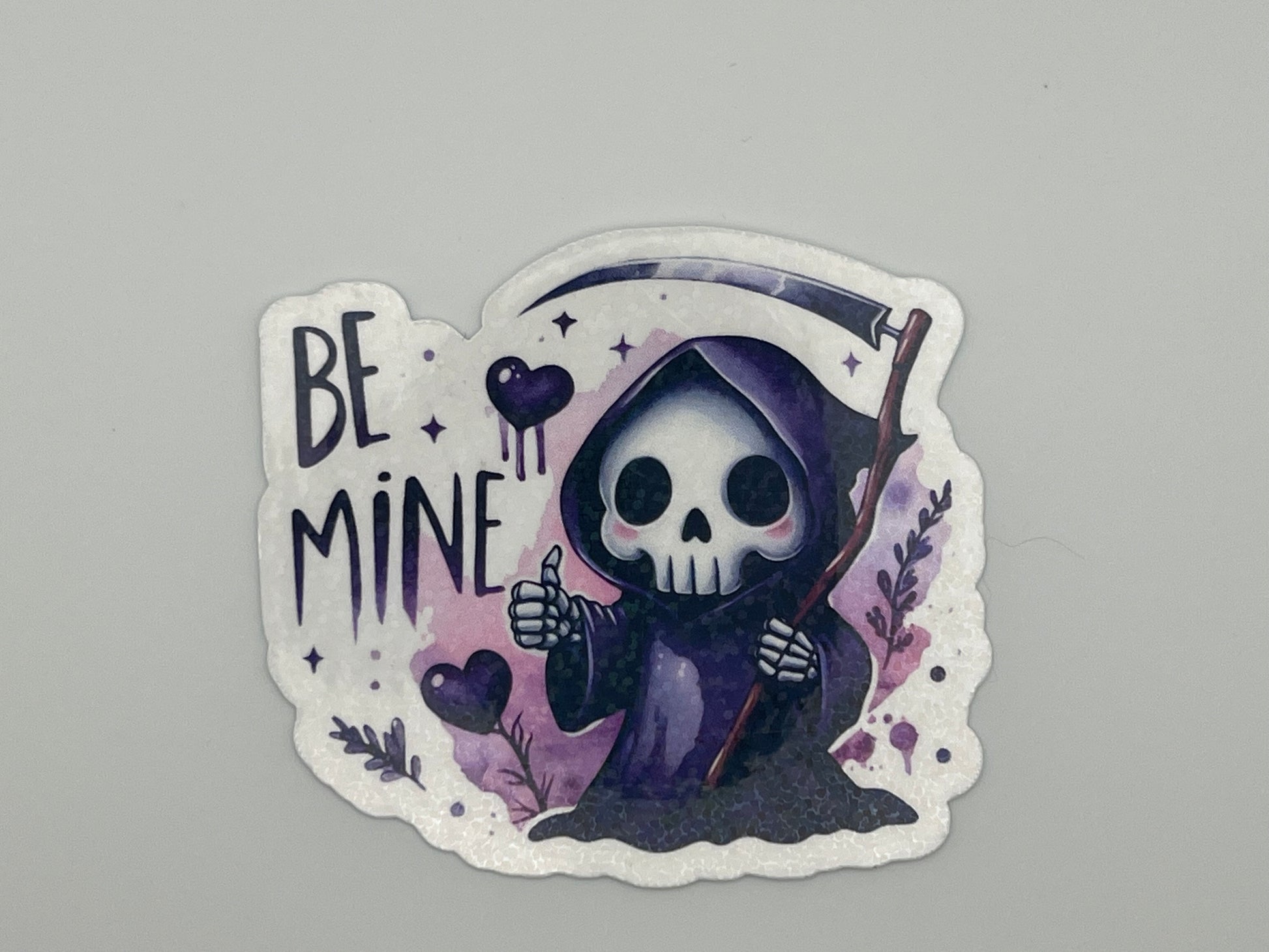 Claim ownership of your valentine's heart with this waterproof, holographic Be Mine sticker. Featuring a charming Grim Reaper, this cute sticker will make any surface pop with quirky personality.